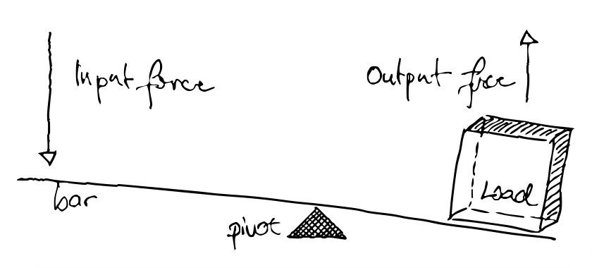 Here's how it works: when you want to lift something heavy, like a big rock, you can use a rigid bar (lever arm) to make the task easier. When you push down on one end of the bar, the other end goes up, lifting the rock with less effort.